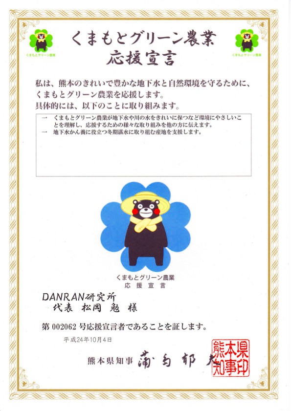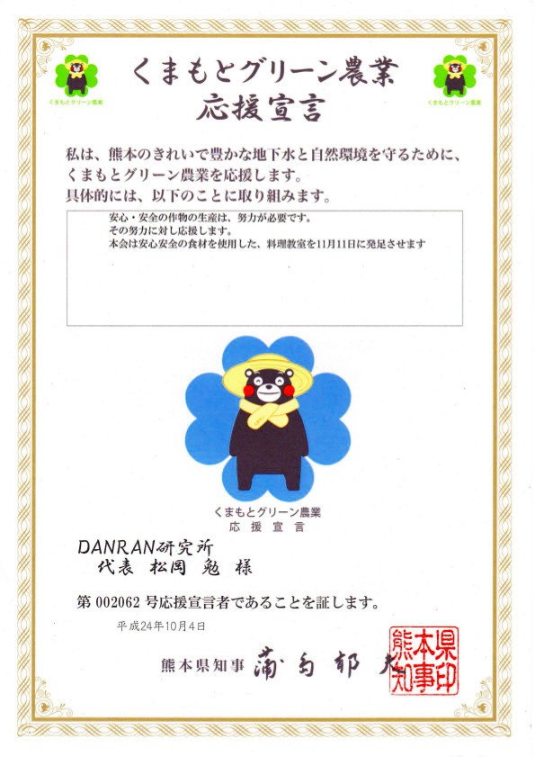 DANRAN研究所はくまもとグリーン農業により生産・加工された商品を普及し応援する団体であることを熊本県知事より認証されています。