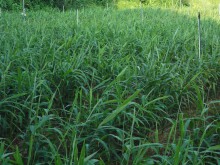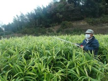 夏の日差しを浴びてスクスク育つ生姜。が、おなじくして雑草も伸びてきます。草をむしってパイロゲンを振りかけて栄養補給!